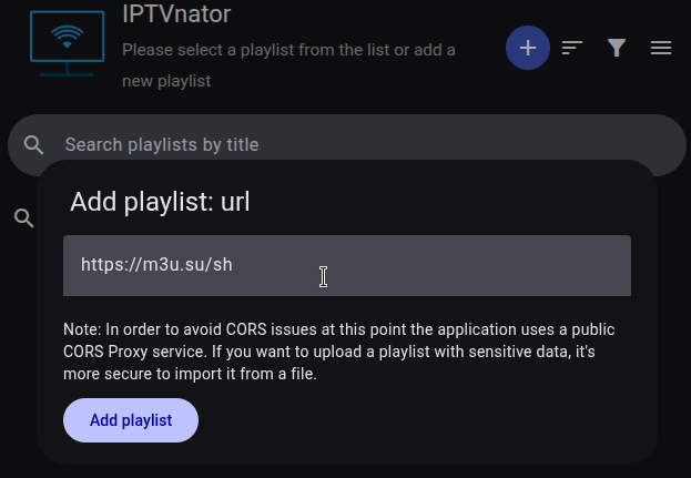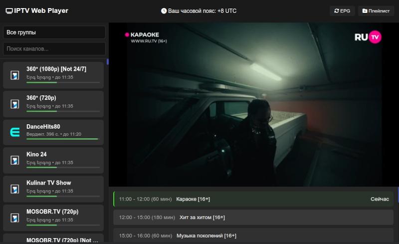 Простой и удобный веб-плеер. Загрузка плейлиста по ссылкам или из файла, но только одного. В качестве тестового плейлиста всем известный (m3u.su/sh)[https://m3u.su/sh/details]. Подгрузка и отображение телепрограммы (используется https://cdn.epg.one/epg2.xml).